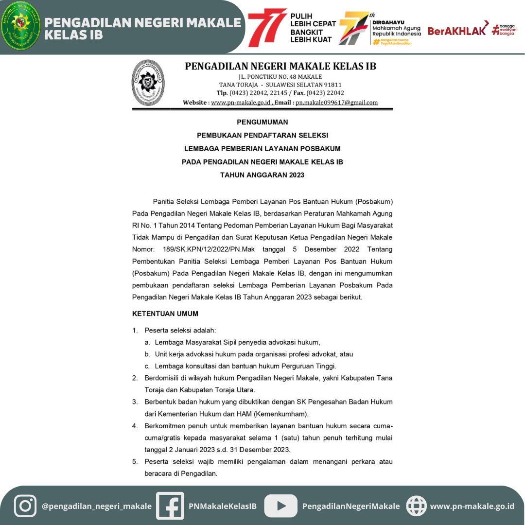 Pada tanggal 18 Juli 2022, Dalam rangka Penjaminan Mutu pada Pengadilan Negeri Makale, Maka diadakan kegiatan Audit Internal untuk menandakan pembukaan kegiatan pemeriksaan secara internal pada bagian bagian yang ada pada Pengadilan Negeri Makale adapun kegiatan pemeriksaan secara internal ini akan berlangsung hingga jumat tanggal 24 Juli 2022